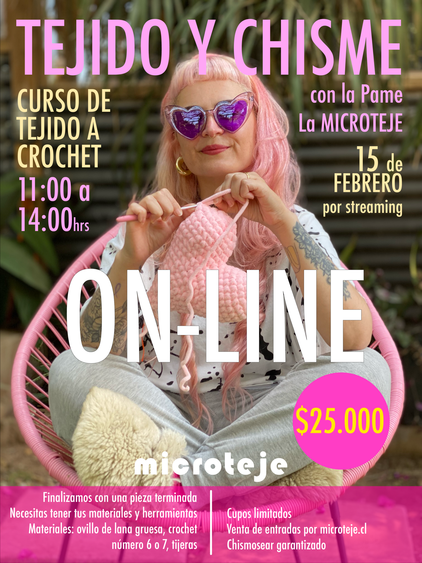 Curso de tejido a crochet On-line desde cero, aprende y disfruta tejiendo y copuchando con la Pame, La Microteje, Los materiales y las herramientas necesarias debes tenerlas contigo. (1 ovillo de lana gruesa, 1 crochet número 6 o 7 y una tijera).